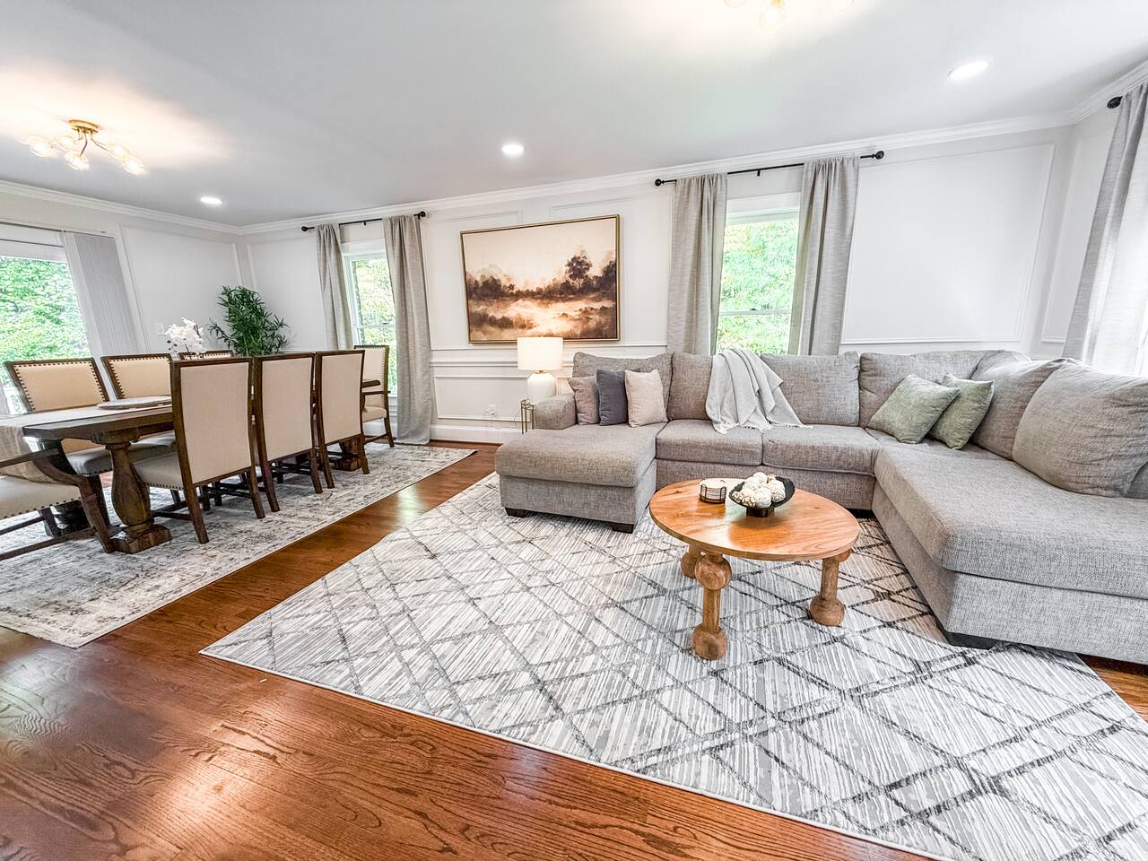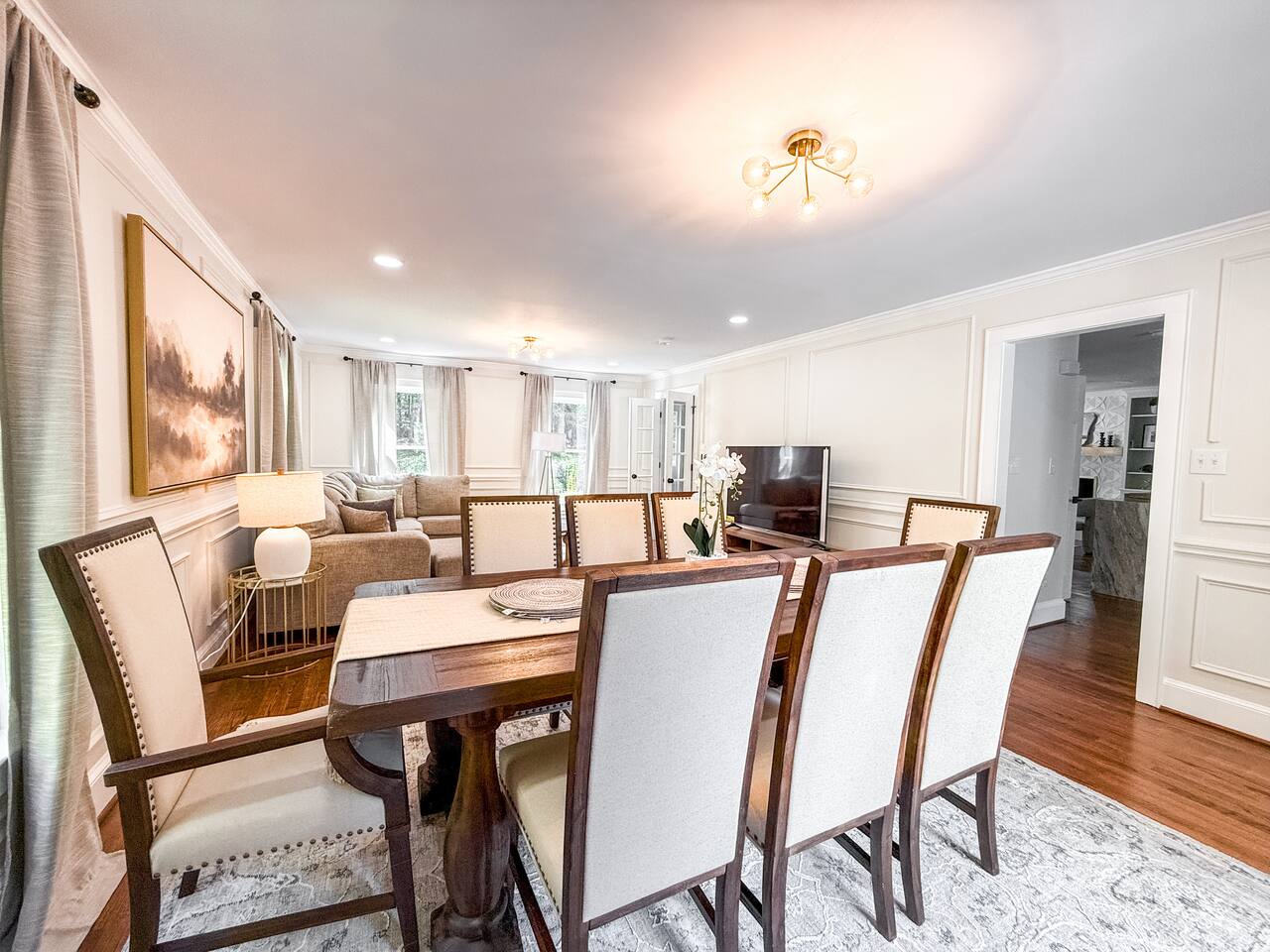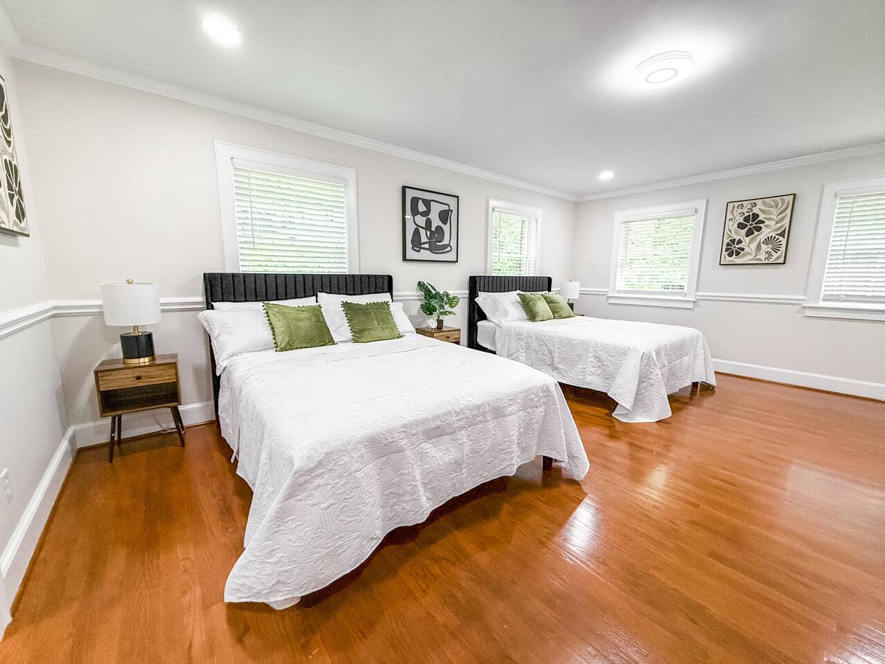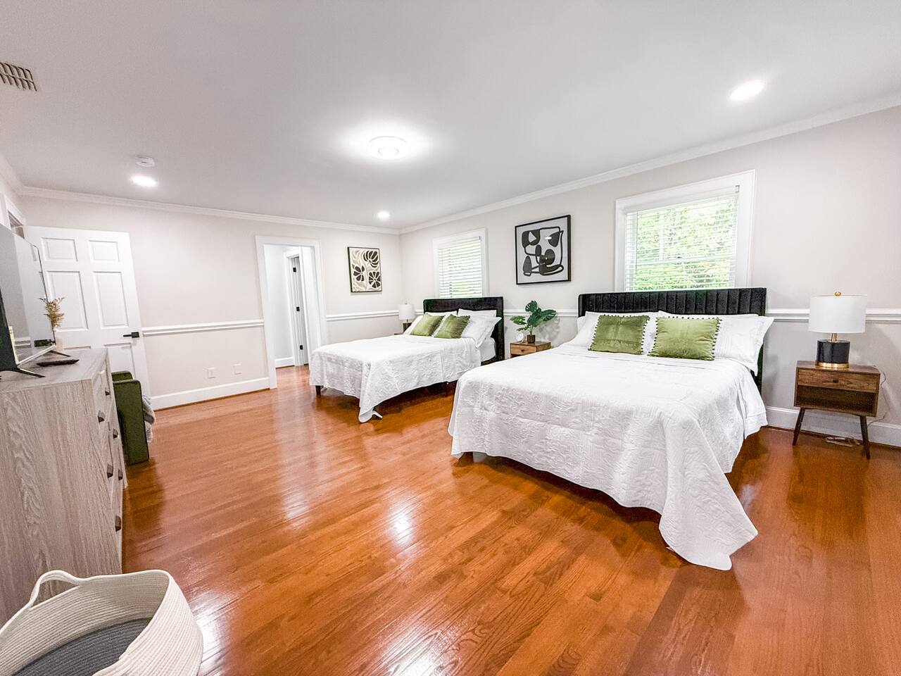 KEY FEATURES: ☀ 5 deluxe bedrooms: 1 king, 6 queen beds, and 2 single trundles. The 4th and 5th bedrooms are connected, providing a seamless layout that's ideal for families or groups. ☀ 3.5 modern bathrooms: including 2 bathtubs and 2 walk-in showers ☀ 3 cozy living rooms; 2 of which are equipped with flat-screen Smart TVs ☀ Fully equipped kitchen with stainless steel appliances and aesthetic design ☀ 3 dining areas: Formal dining room with an 8-seater wooden table, breakfast nook seating 6, and a 4-seater kitchen island ☀ In-unit laundry: washer + dryer ☀ Stable Wi-Fi (300-500 Mbps) ☀ Central air conditioning with a smart thermostat ☀ Expansive back deck for outdoor relaxation ☀ Large backyard for leisure ☀ Ample parking space for multiple vehicles