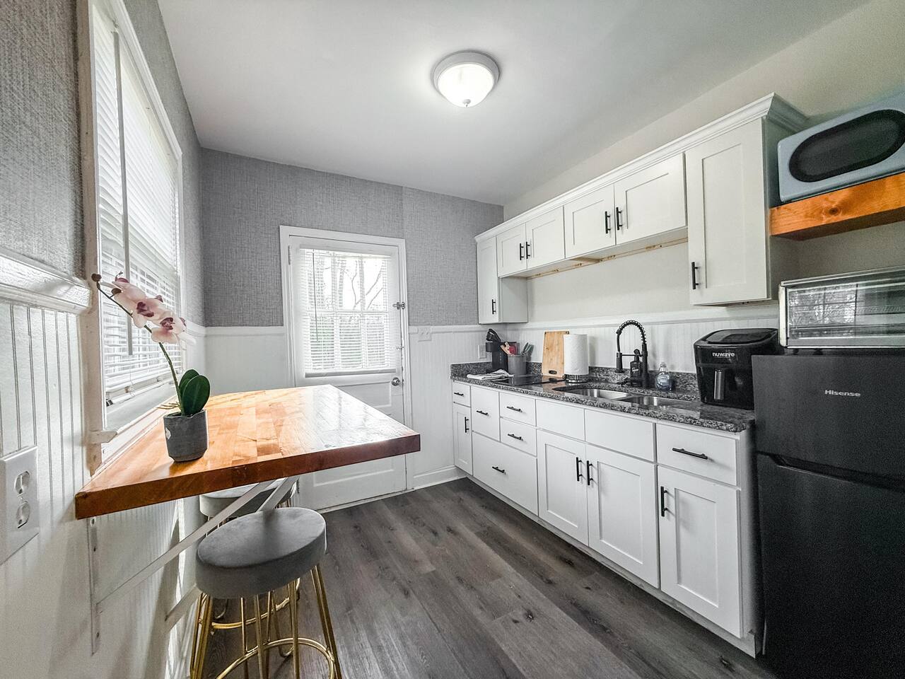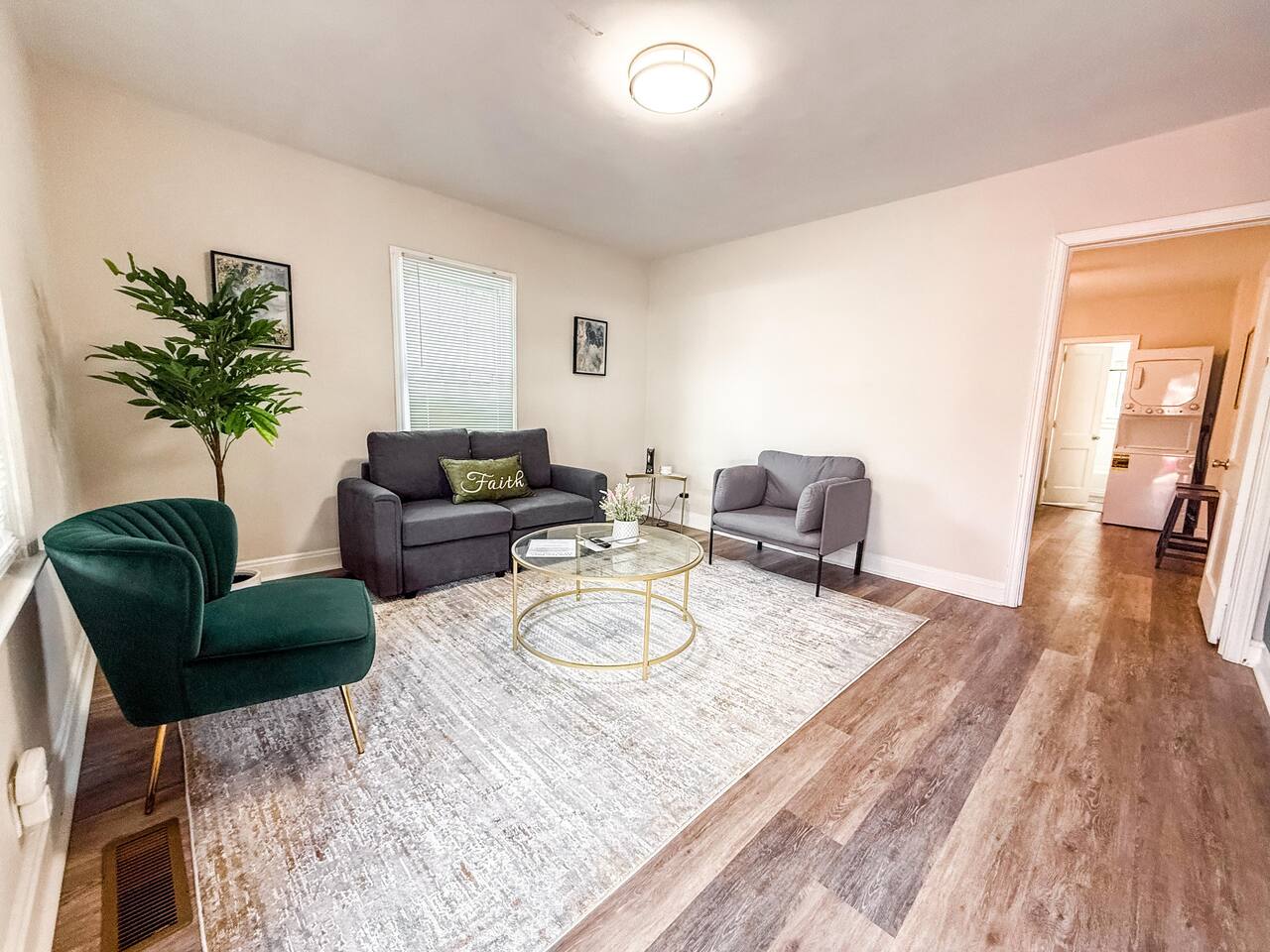 Step into our recently renovated 1940s duplex, where classic charm meets modern comfort. Our cozy bedroom features a comfortable queen-size bed, offering a perfect retreat after a day of exploring. In our compact yet well-equipped kitchen, you'll find everything you need for quick meals or snacks. With an induction cooktop, compact fridge, and microwave, preparing and enjoying a home-cooked meal is effortless. The living room offers a welcoming atmosphere with its comfortable sofa and flat-screen Smart TV. This inviting space is perfect for unwinding after a day of adventures or spending quality time with loved ones, making it a central spot for relaxation and entertainment. The in-unit washer and dryer are conveniently located within the bedroom, providing easy access for guests. This setup allows you to take care of your laundry without having to leave the comfort of your living space. Whether you're staying for a short or extended period, having the washer and dryer so close ensures a hassle-free experience when it comes to keeping your clothes fresh and clean. Whether you're visiting for business or leisure, our duplex offers convenience and affordability in the heart of Durham. We look forward to welcoming you! For added security, this property is equipped with an exterior security camera positioned at the front that features motion detection and recording capabilities, ensuring an extra layer of safety during your stay. Please rest assured that your privacy is our top priority. The camera is strictly for exterior monitoring and does not have access to any interior spaces. It is solely in place to enhance security and ensure peace of mind for our guests.