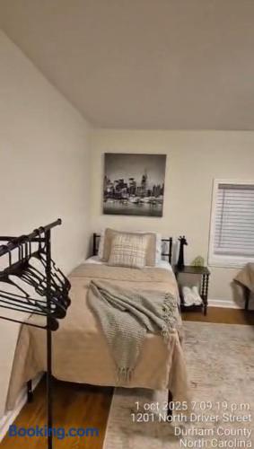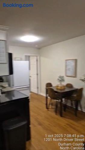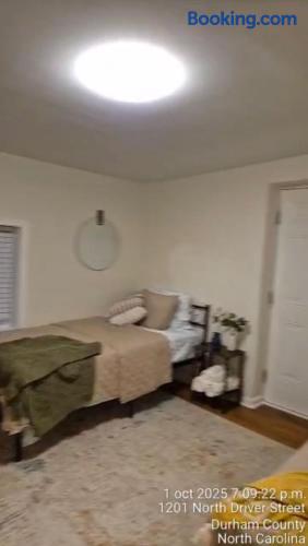Comfortable shotgun-style duplex in central Durham. A simple space suited for couples, small families, or business travelers near downtown, dining, coffee shops, entertainment, and major highways. Important: The bathroom is in the middle bedroom, and to reach the back bedroom you must walk through the front one. If privacy matters, this may not work. Please watch the video for layout details. Located in an up-and-coming neighborhood with both older and new homes—review the area before booking.