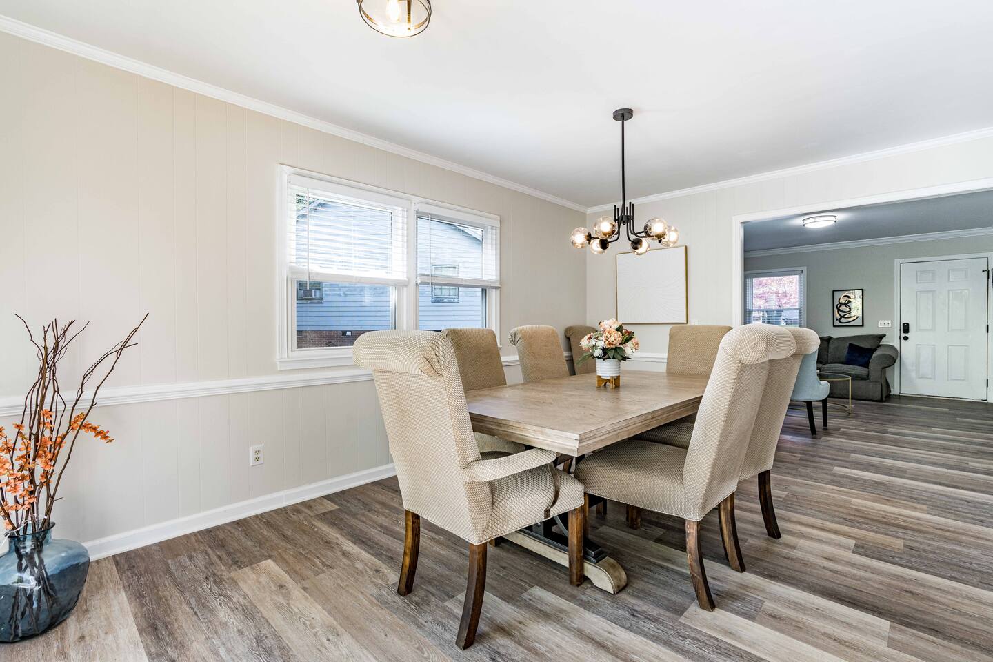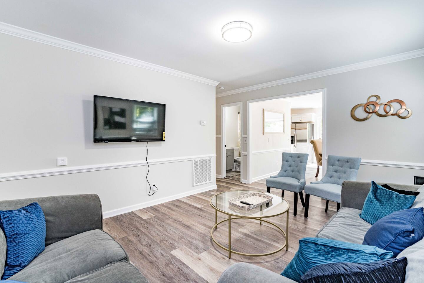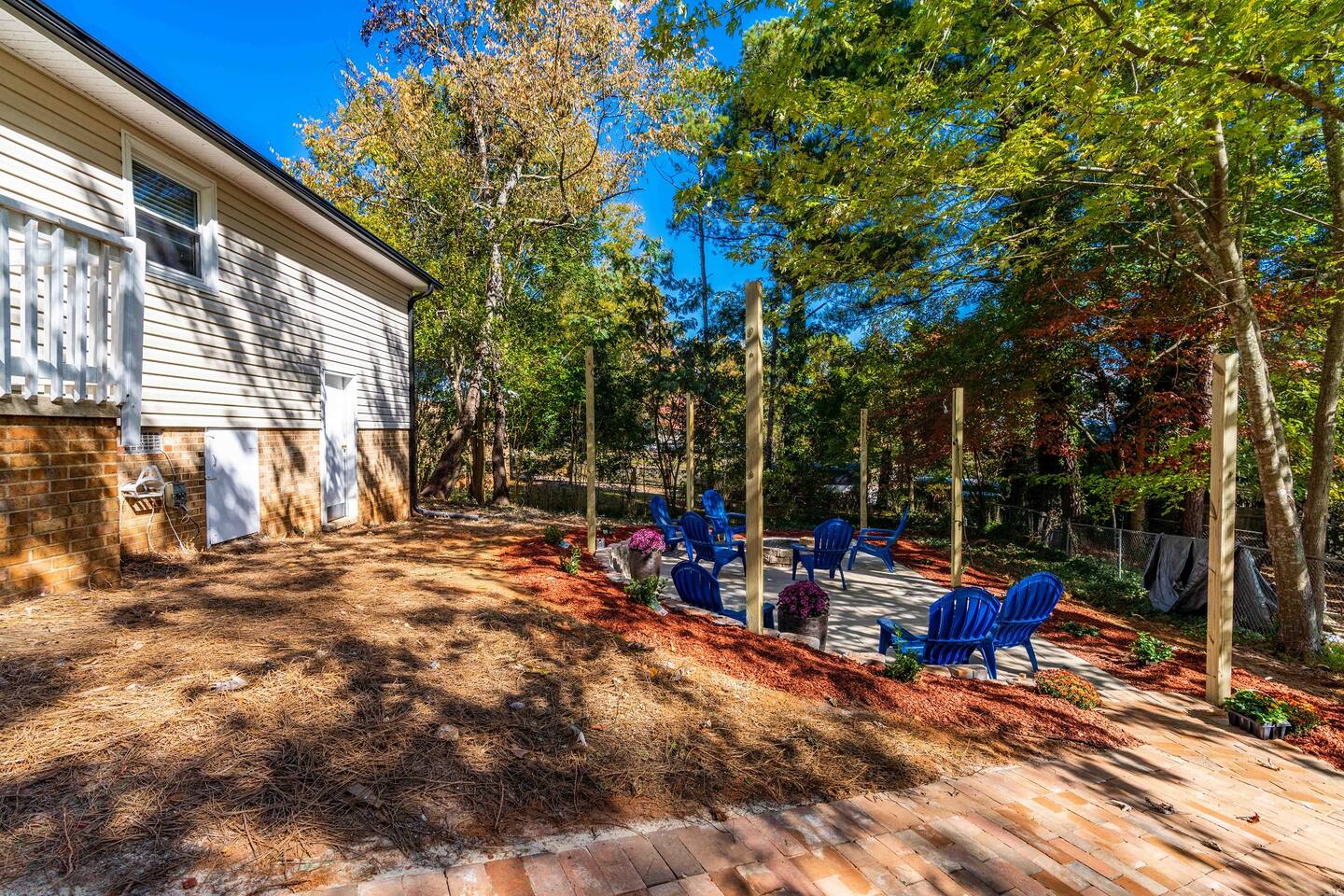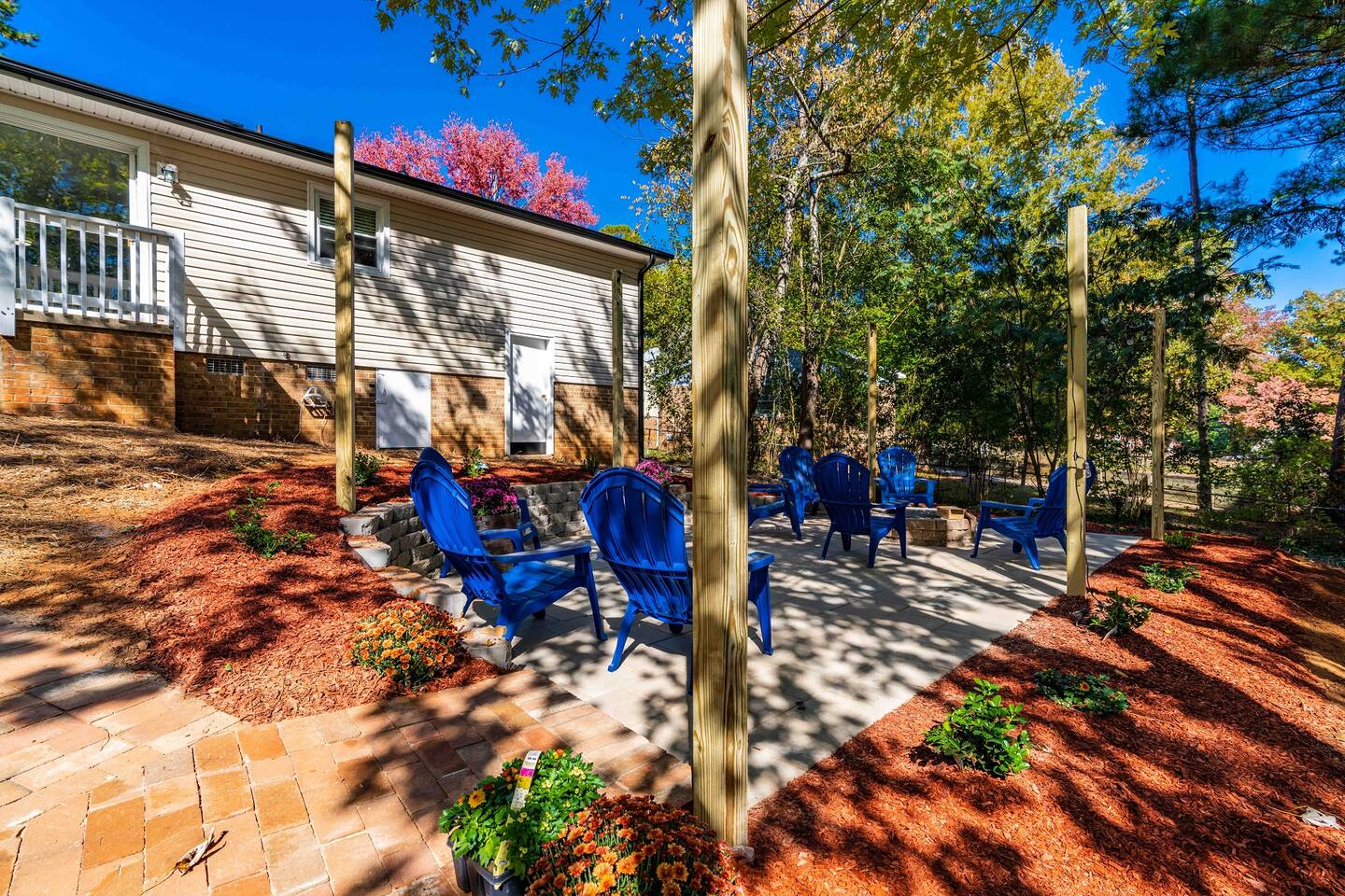 Beautifully updated home in North Raleigh, 8 minutes away from North Hills and close to Wakemed North Raleigh. The house features 3 bedrooms and 1.5 bathroom. It comes with one king bed, 2 queen beds and 1 pull out sofa. There is a nice patio outside that can be used and it has a firepit.