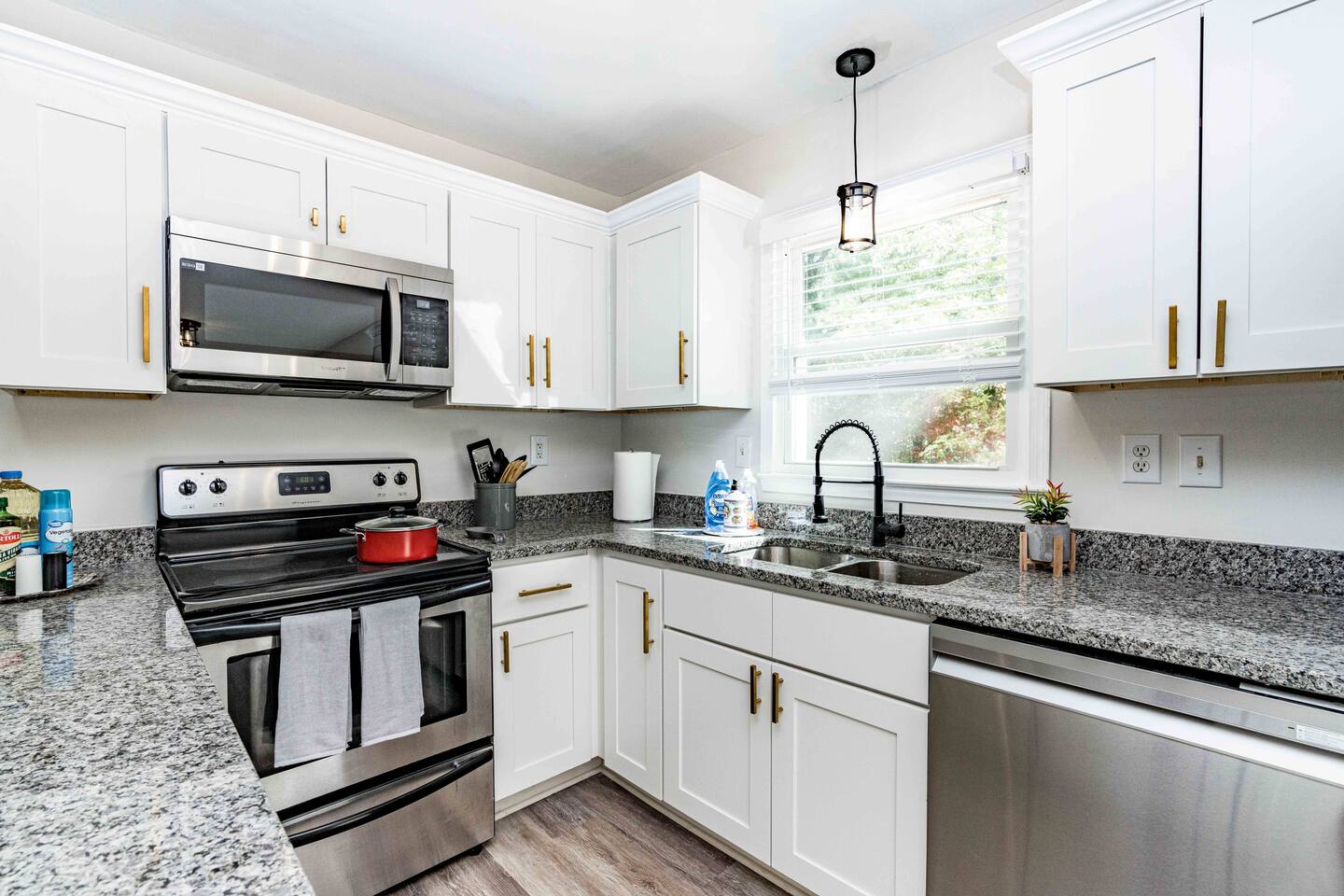 KEY FEATURES: ☀ 3 deluxe bedrooms; 1 king, 2 queens ☀ 1 full modern bathroom and half bathroom ☀ Cozy living room with pull-out sofa and a flat-screen Smart TV ☀ Full kitchen with stainless steel appliances, cookware and utensils ☀ Dining Area w/ 6-seater table ☀ Laundry Area w/ In-unit washer + dryer ☀ Stable wifi 300-500mbps ☀ Centralized AC with a smart thermostat ☀ Fully fenced backyard with fire pit ☀ Parking Area ☀ Prime location only minutes from North Hills and WakeMed North Raleigh For added security, this property is equipped with a doorbell camera positioned at the front door and two exterior security cameras positioned at each corner of the back part of the property. These cameras are equipped with motion detection and recording capabilities, ensuring an extra layer of safety during your stay. Please rest assured that your privacy is our top priority. The cameras are strictly for exterior monitoring and do not have access to any interior spaces. They are solely in place to enhance security and ensure peace of mind for our guests.