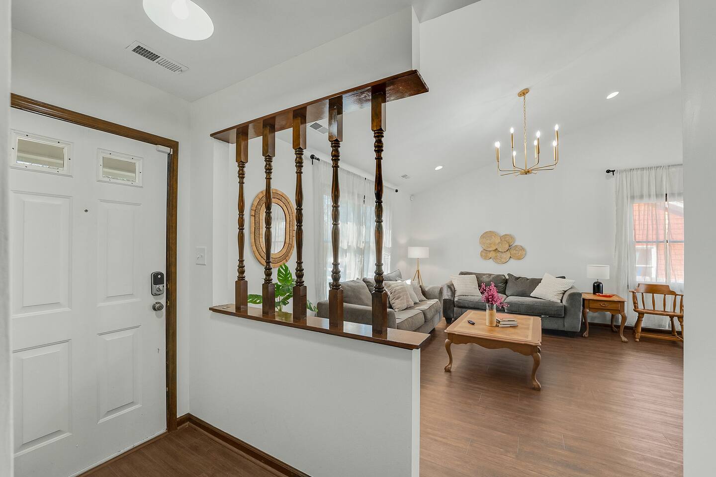 KEY FEATURES: ☀ 3 deluxe bedrooms; 1 king, 2 queens ☀ 2 full modern bathroom; bathtub and walk-in shower ☀ Cozy living room with flat screen Smart TV ☀ Full kitchen with stainless steel appliances, cookware and utensils ☀ Dining Area w/ 6-seater table with extra seats at kitchen bar ☀ Laundry Area w/ In-unit washer + dryer ☀ Stable wifi 300-500mbps ☀ Centralized AC with a smart thermostat ☀ Fully fenced backyard For added security, this property is equipped with a doorbell camera positioned at the front door and two exterior security cameras positioned at each corner of the back part of the property. These cameras are equipped with motion detection and recording capabilities, ensuring an extra layer of safety during your stay. Please rest assured that your privacy is our top priority. The cameras are strictly for exterior monitoring and do not have access to any interior spaces. They are solely in place to enhance security and ensure peace of mind for our guests.