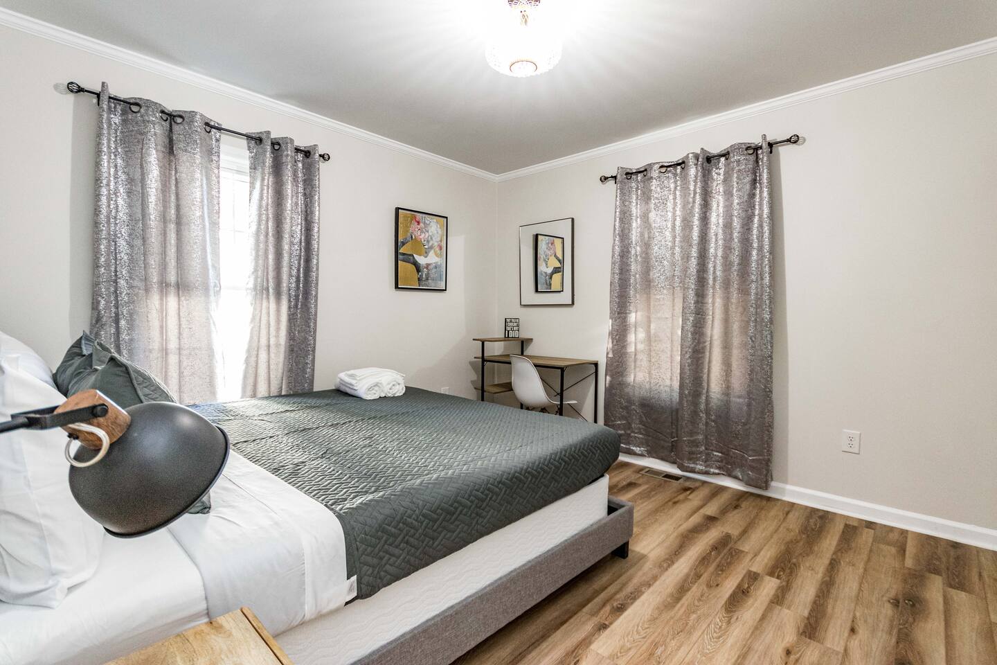With 4 deluxe bedrooms, Lee can host up to 8 people, making it the perfect choice for large groups or families. The master bedroom features a king-sized bed, while the other 3 bedrooms are equipped with plush queen-sized beds, ensuring a comfortable and restful night's sleep for everyone. Lee also features 2 full bathrooms, providing plenty of space and convenience for everyone to get ready and refreshed each day. And with a nicely equipped kitchen, you'll have many things you need to prepare your favorite meals and enjoy them with loved ones. But that's not all - Lee is also equipped with all the modern amenities you need to make your stay as comfortable and convenient as possible. From high-speed internet access and a flat-screen Smart TV to a washer and dryer and air conditioning, every detail has been carefully thought out to ensure you have everything you need to enjoy a stress-free stay. And with its unbeatable location just minutes away from Downtown Raleigh, Lee is the perfect home base for exploring all the city has to offer. Whether you're here for work or play, you'll appreciate the convenience and comfort of this beautiful and inviting home. So why wait? Book your stay at Lee today and start experiencing the very best of Raleigh in this stunning and spacious home. Important attractions Dorothea Dixie Park (3 - minute drive) Downtown Raleigh (5-minute drive) North Carolina State Capitol (5-minute drive) North Carolina Museum of History (5-minute drive) North Carolina Museum of Natural Sciences (5-minute drive) Marbles Kids Museum (5-minute drive) Red Hat Amphitheater (5-minute drive) Raleigh Convention Center (5-minute drive) Duke Energy Center for the Performing Arts (5-minute drive) NC State University (10-minute drive) Additionally, the address is located close to a variety of restaurants, bars, cafes, and shops, making it easy to enjoy the local cuisine and pick up any essentials you may need during your stay. For added security, this property is equipped with a doorbell camera positioned at the front door and two exterior security cameras positioned at each corner of the back part of the property. These cameras are equipped with motion detection and recording capabilities, ensuring an extra layer of safety during your stay. Please rest assured that your privacy is our top priority. The cameras are strictly for exterior monitoring and do not have access to any interior spaces. They are solely in place to enhance security and ensure peace of mind for our guests.