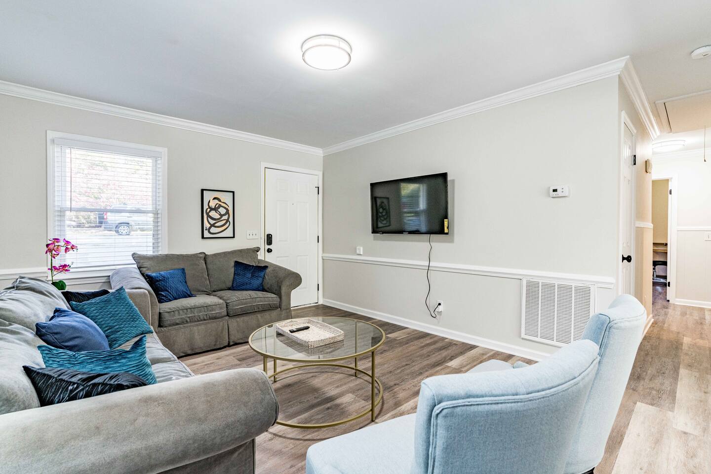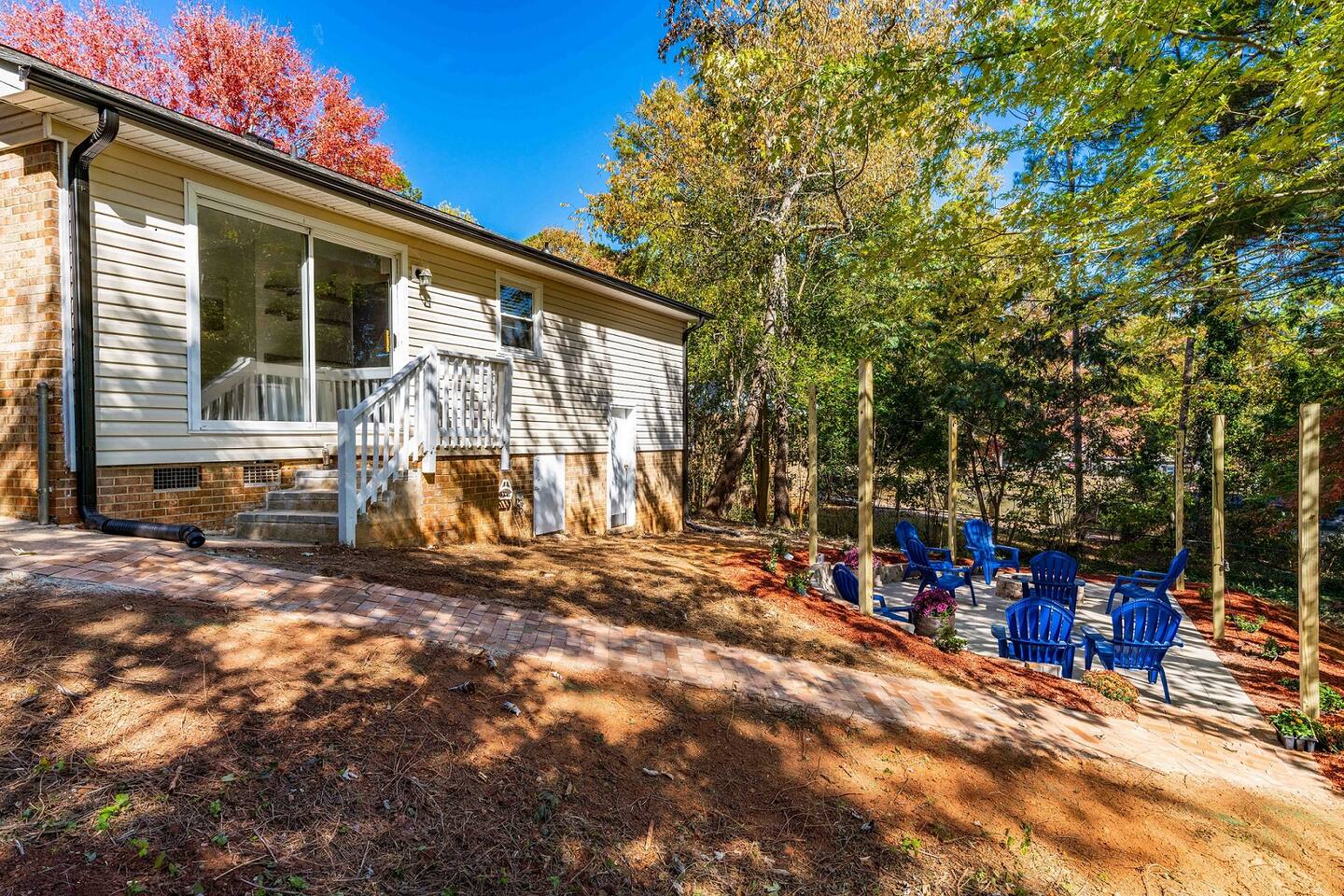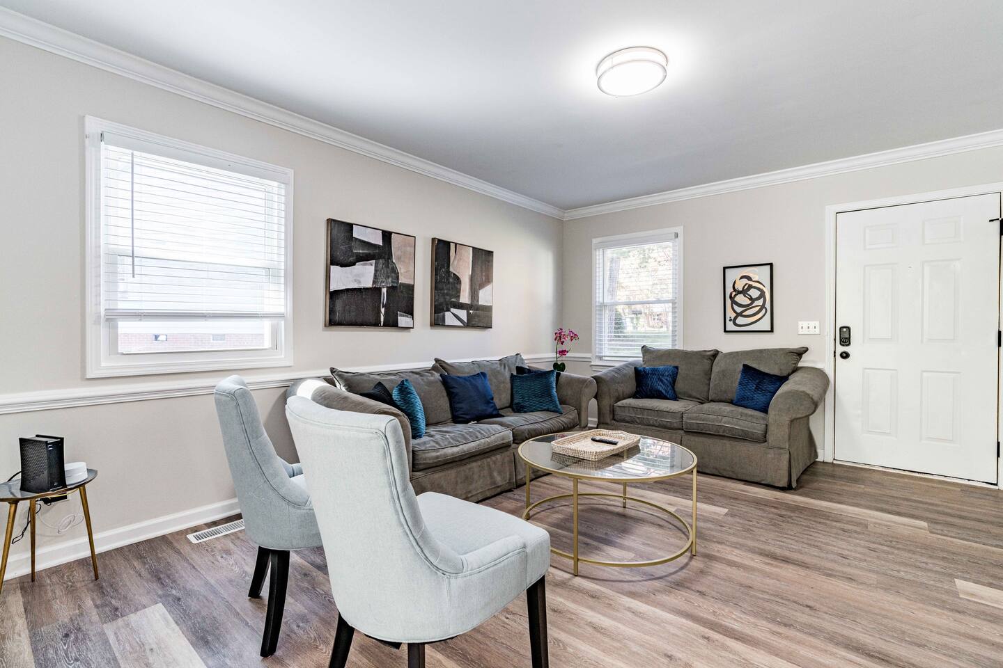 KEY FEATURES: ☀ 3 deluxe bedrooms; 1 king, 2 queens ☀ 1 full modern bathroom and half bathroom ☀ Cozy living room with pull-out sofa and a flat-screen Smart TV ☀ Full kitchen with stainless steel appliances, cookware and utensils ☀ Dining Area w/ 6-seater table ☀ Laundry Area w/ In-unit washer + dryer ☀ Stable wifi 300-500mbps ☀ Centralized AC with a smart thermostat ☀ Fully fenced backyard with fire pit ☀ Parking Area ☀ Prime location only minutes from North Hills and WakeMed North Raleigh For added security, this property is equipped with a doorbell camera positioned at the front door and two exterior security cameras positioned at each corner of the back part of the property. These cameras are equipped with motion detection and recording capabilities, ensuring an extra layer of safety during your stay. Please rest assured that your privacy is our top priority. The cameras are strictly for exterior monitoring and do not have access to any interior spaces. They are solely in place to enhance security and ensure peace of mind for our guests.