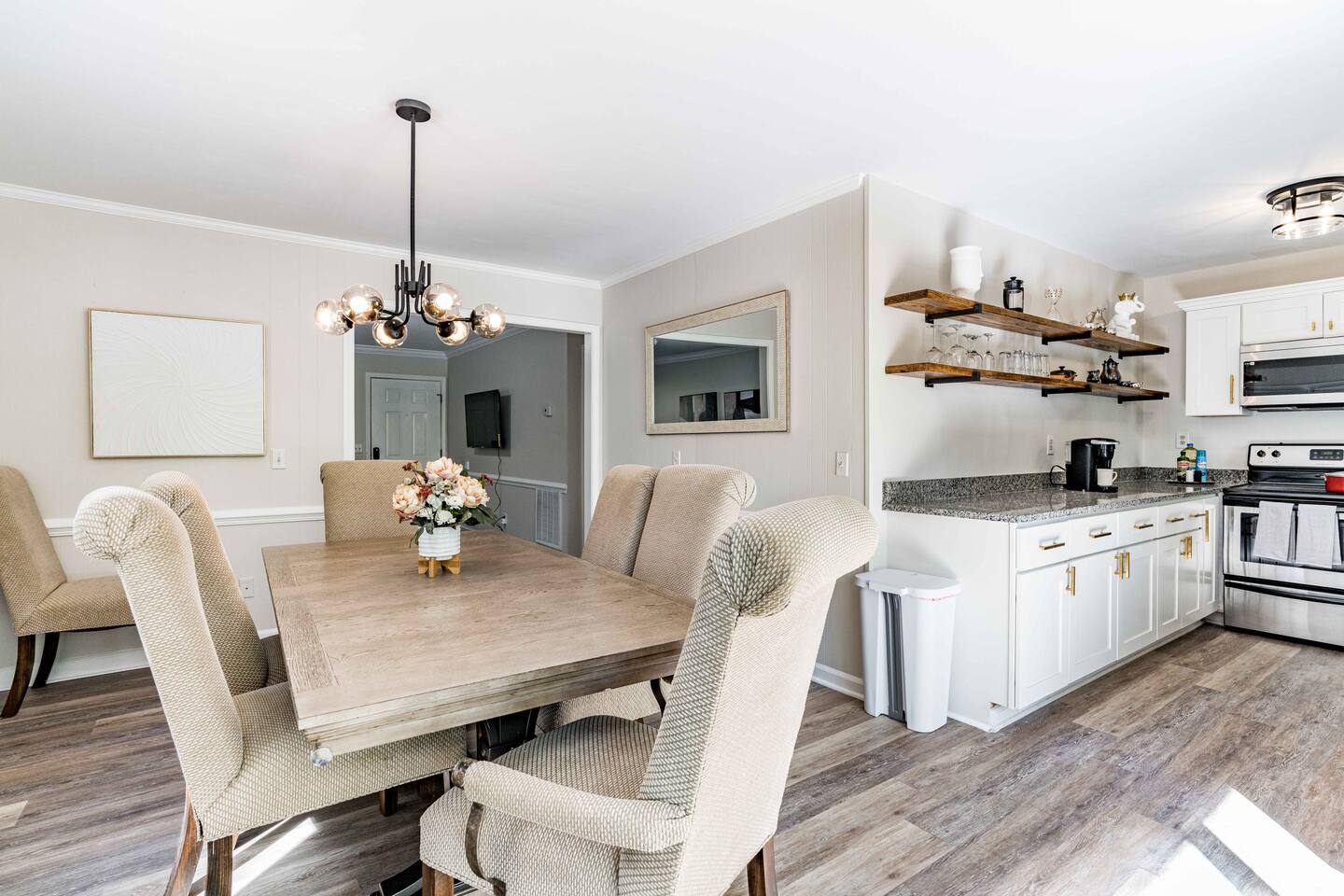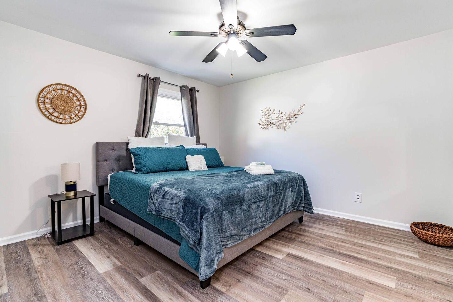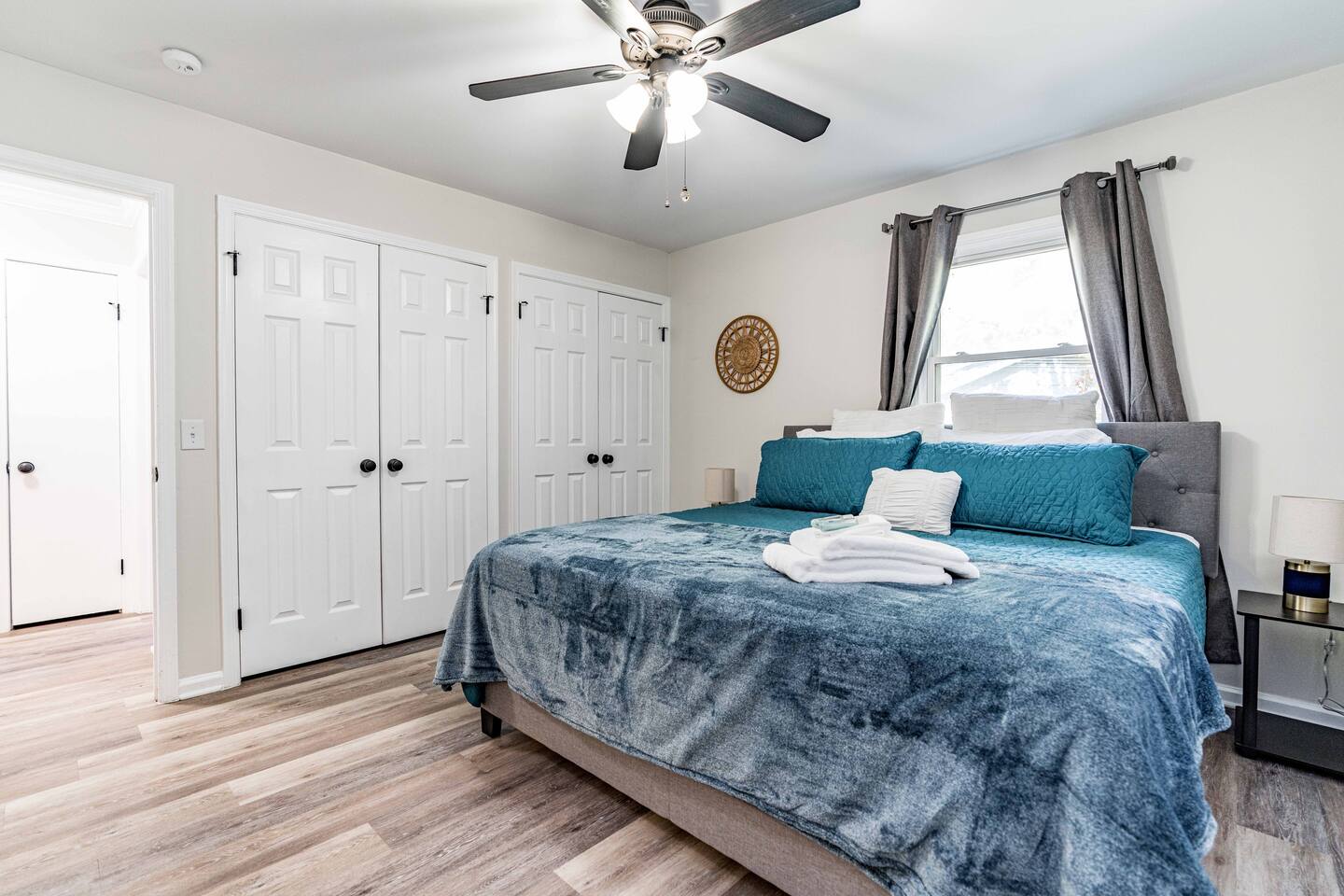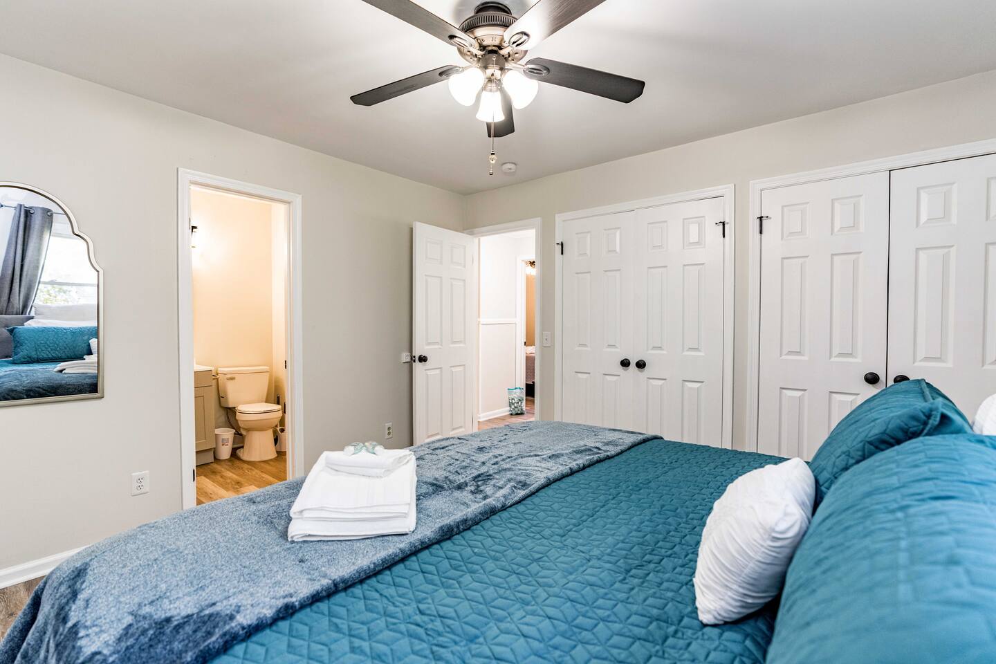 KEY FEATURES: ☀ 3 deluxe bedrooms; 1 king, 2 queens ☀ 1 full modern bathroom and half bathroom ☀ Cozy living room with pull-out sofa and a flat-screen Smart TV ☀ Full kitchen with stainless steel appliances, cookware and utensils ☀ Dining Area w/ 6-seater table ☀ Laundry Area w/ In-unit washer + dryer ☀ Stable wifi 300-500mbps ☀ Centralized AC with a smart thermostat ☀ Fully fenced backyard with fire pit ☀ Parking Area ☀ Prime location only minutes from North Hills and WakeMed North Raleigh For added security, this property is equipped with a doorbell camera positioned at the front door and two exterior security cameras positioned at each corner of the back part of the property. These cameras are equipped with motion detection and recording capabilities, ensuring an extra layer of safety during your stay. Please rest assured that your privacy is our top priority. The cameras are strictly for exterior monitoring and do not have access to any interior spaces. They are solely in place to enhance security and ensure peace of mind for our guests.