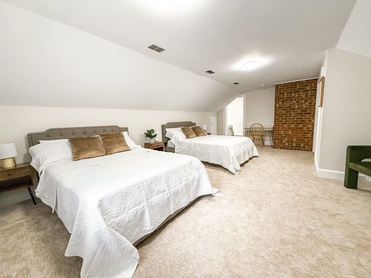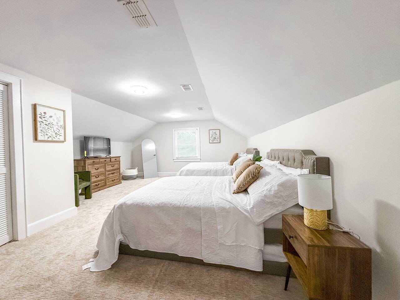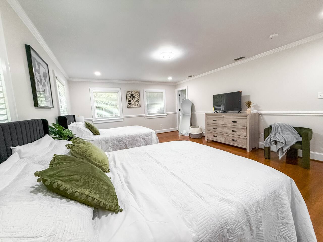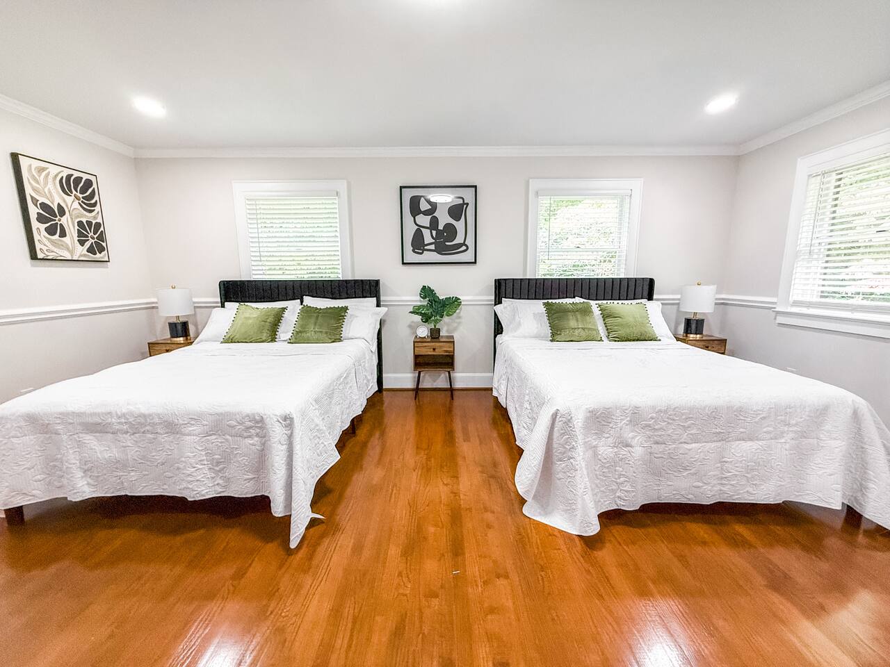 KEY FEATURES: ☀ 5 deluxe bedrooms: 1 king, 6 queen beds, and 2 single trundles. The 4th and 5th bedrooms are connected, providing a seamless layout that's ideal for families or groups. ☀ 3.5 modern bathrooms: including 2 bathtubs and 2 walk-in showers ☀ 3 cozy living rooms; 2 of which are equipped with flat-screen Smart TVs ☀ Fully equipped kitchen with stainless steel appliances and aesthetic design ☀ 3 dining areas: Formal dining room with an 8-seater wooden table, breakfast nook seating 6, and a 4-seater kitchen island ☀ In-unit laundry: washer + dryer ☀ Stable Wi-Fi (300-500 Mbps) ☀ Central air conditioning with a smart thermostat ☀ Expansive back deck for outdoor relaxation ☀ Large backyard for leisure ☀ Ample parking space for multiple vehicles